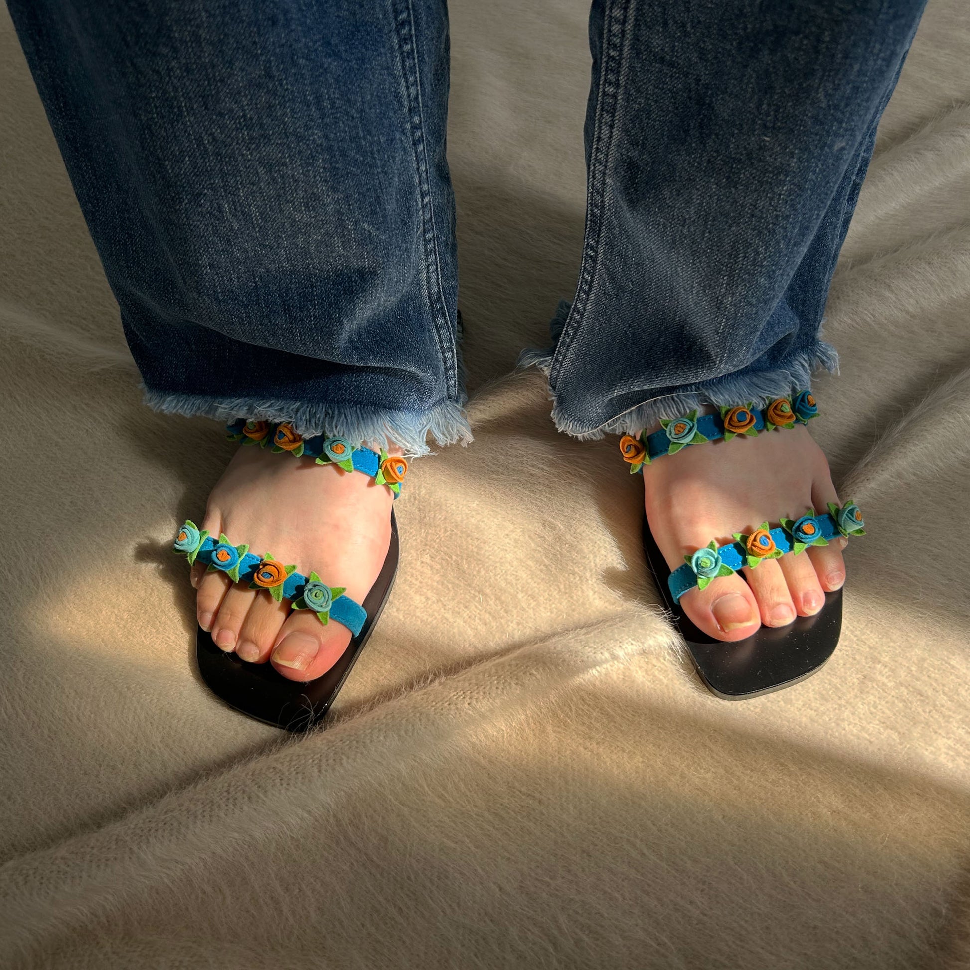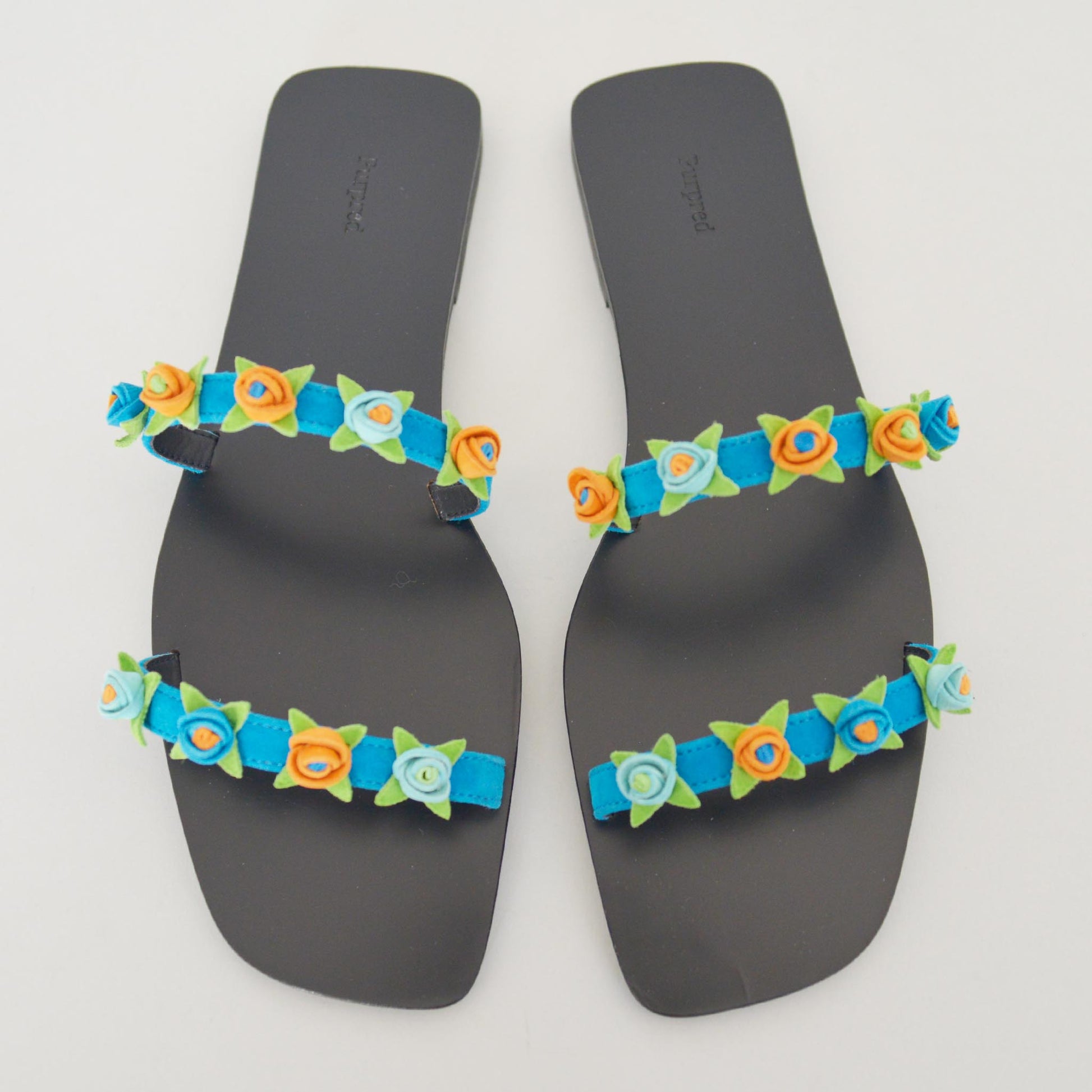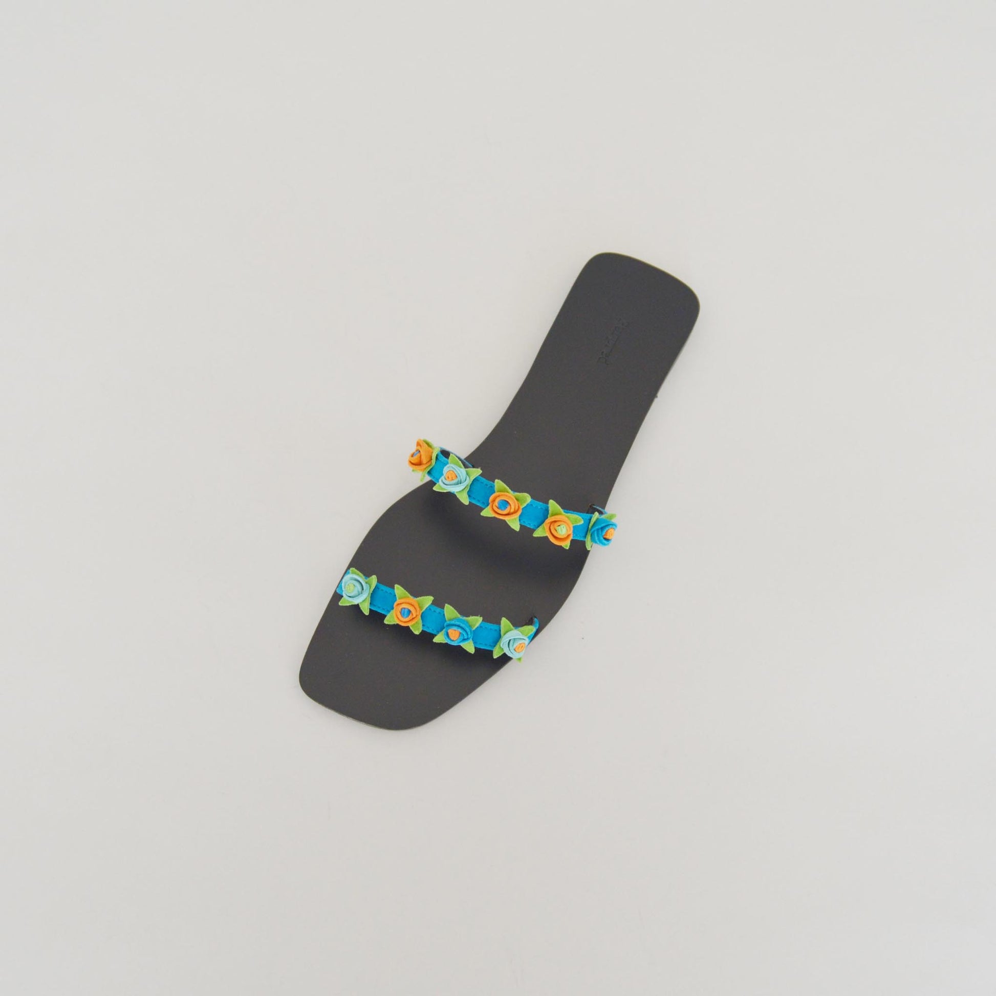 マルチカラーの小さなお花をスウェードで作り並べています。曲線的な底のシルエットに仕上げています。