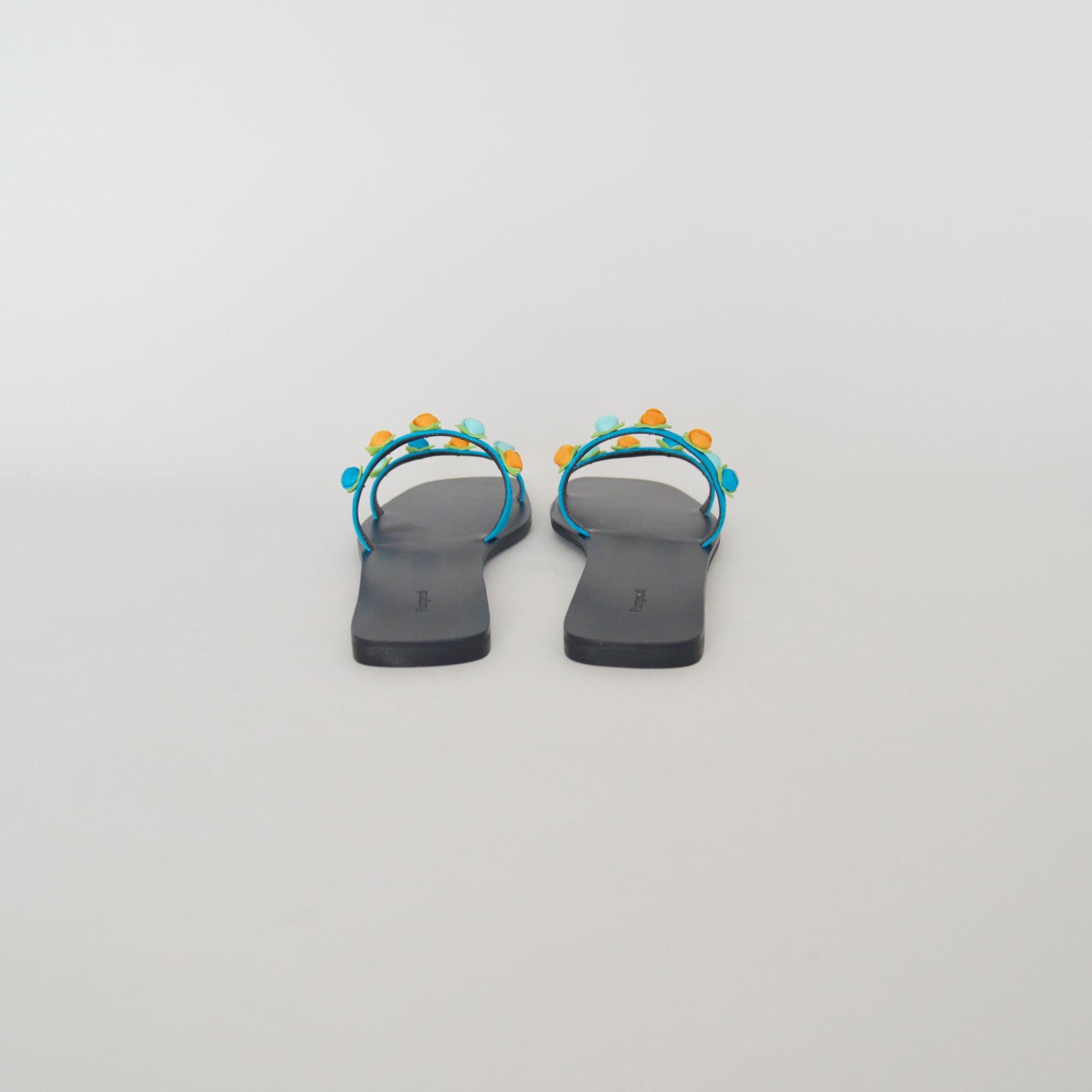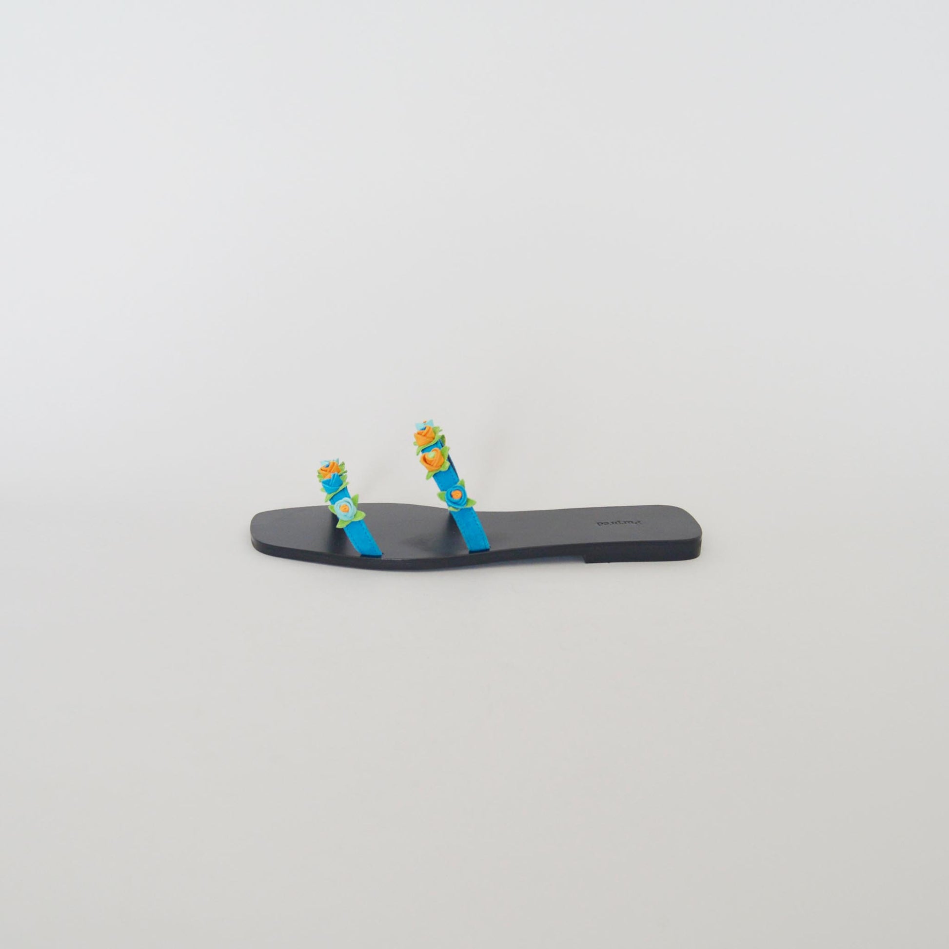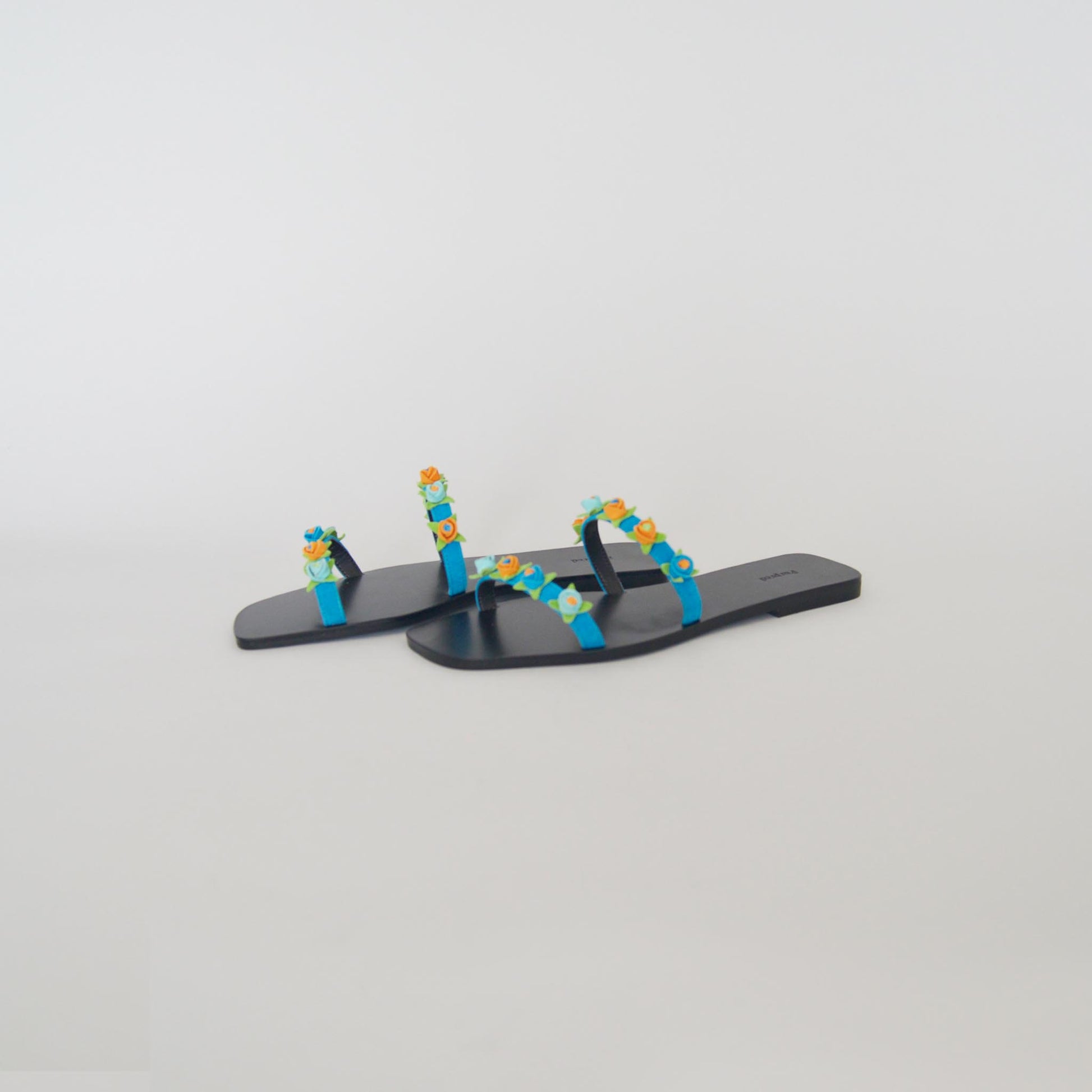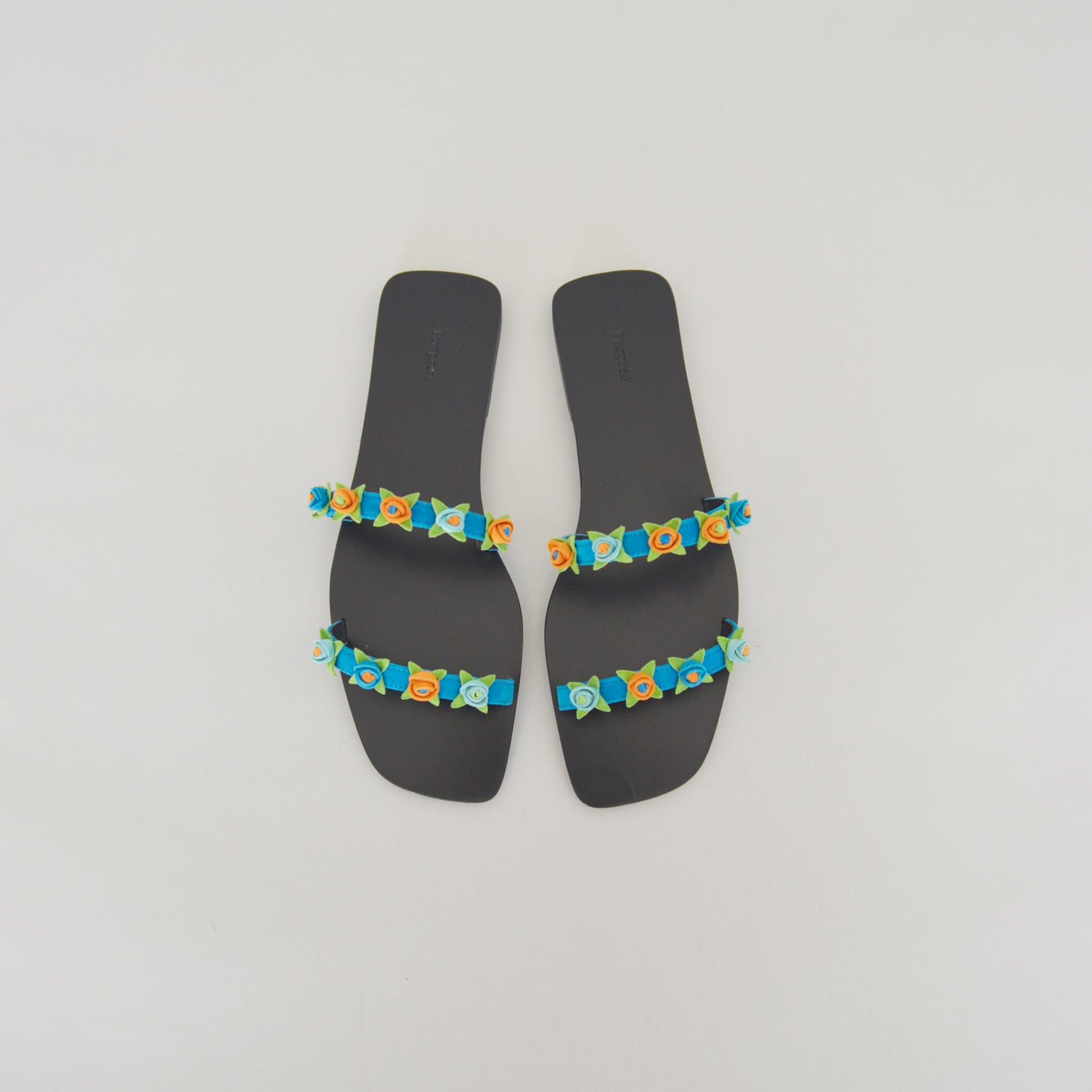 マルチカラーの小さなお花をスウェードで作り並べています。曲線的な底のシルエットに仕上げています。